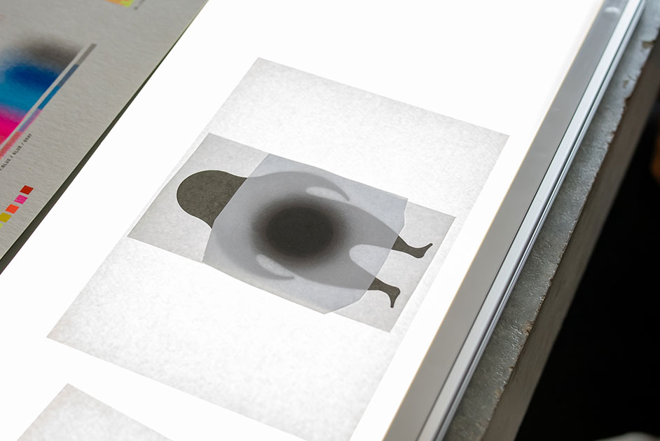 内間 スキャン濃度を変えることで版の穴の大きさが変更できるので、グラデーションや細い線もきちんと表現できるんです。次に3版目を印刷しますが、1、2版目をご覧になって、色のアイディアは浮かびましたか……?