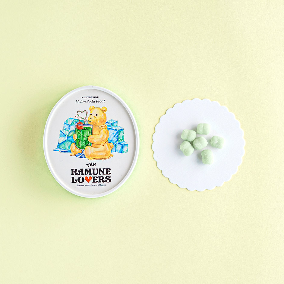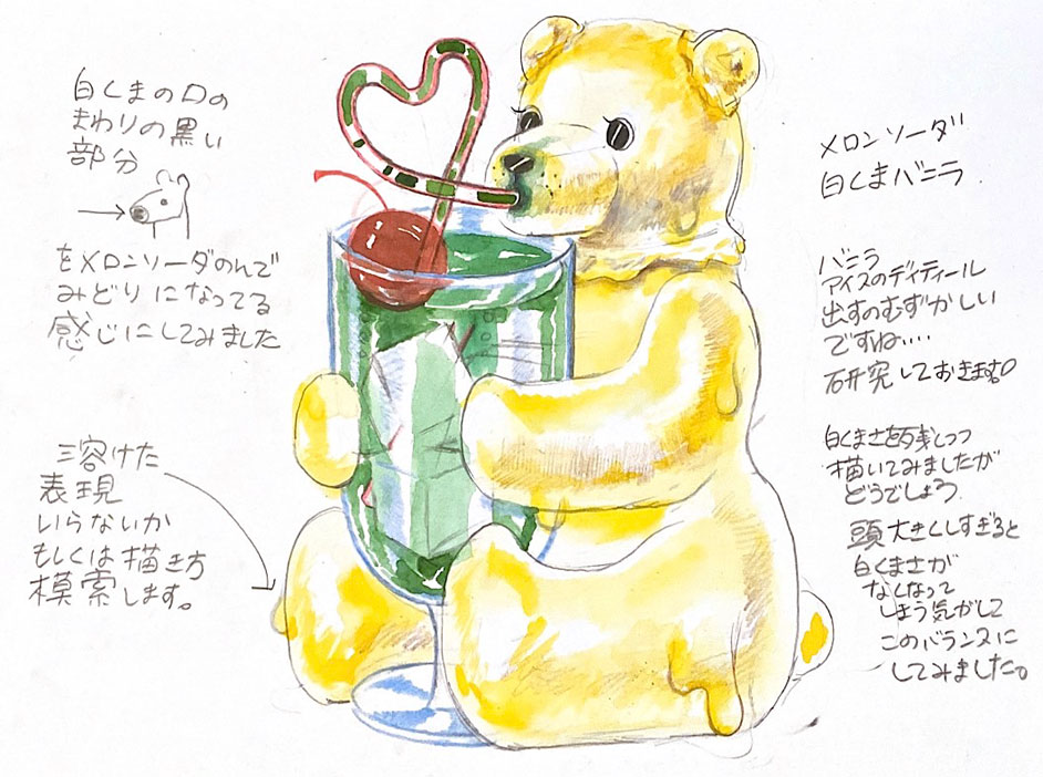 メロン果汁を贅沢に使用した「生ラムネ:メロンクリームソーダ」。「メロンソーダを飲んだときの喜び、子どもの頃に感じた懐かしさを表現。そこに、大人も満足できる高級メロンの味わいを融合しました。イラストでこだわったのは、バニラアイスを“シロクマ化”すること。名前はアイスクマ。幸福感も意識しています」(藤木さん)