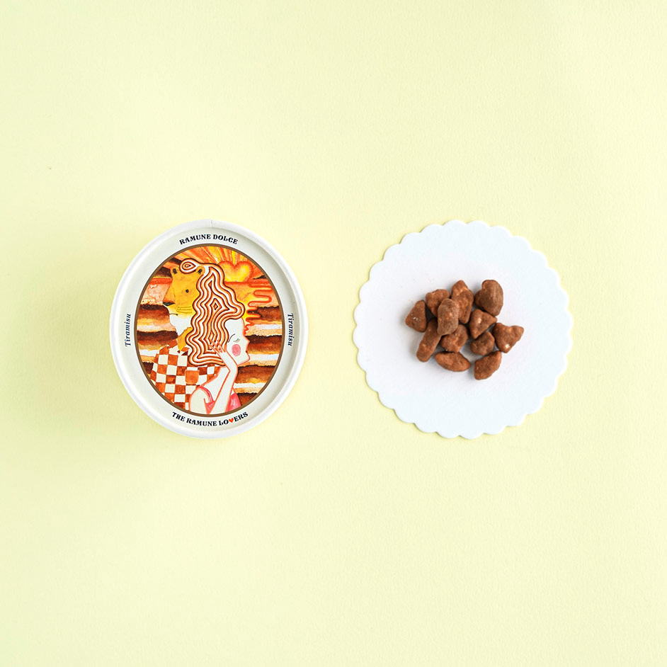 チョコレートをコーディングしたラムネ「ラムネドルチェ:ティラミス」。「生ラムネのキュートイメージとは打って変わって、ムーディーな映画のワンシーンのように仕上げました。テーマは“会えない2人”。ティラミスの女性にだけ“ミス・ティラミス”という隠れネームが付いています」(同上)