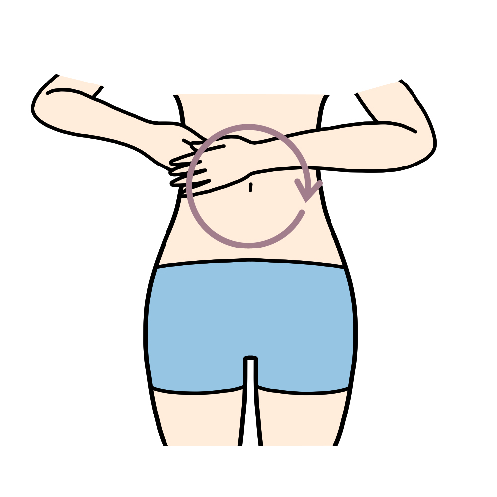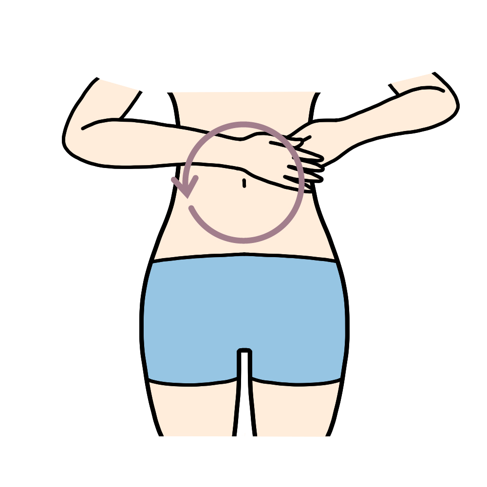 | 1)お腹の上で両手を重ね、へそを中心に左回り(時計と逆回り)に8回さする。 |