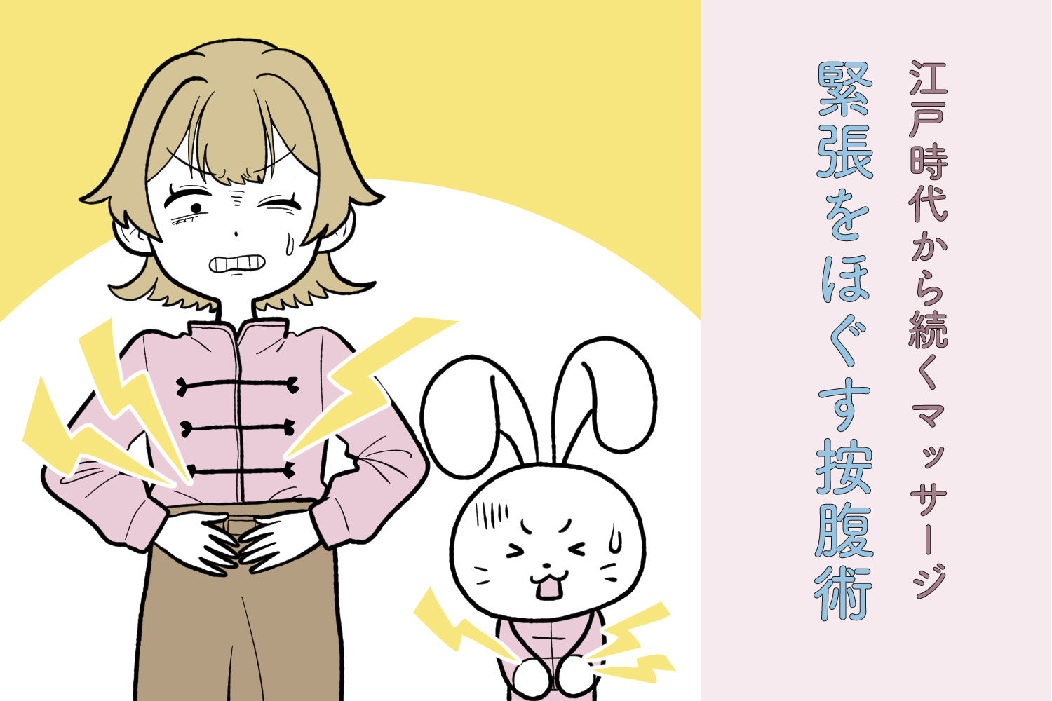 いつも緊張していて身体がガチガチ。気づくと便秘に悩まされている……。そんな人は、もしかしたらお腹が硬い状態かもしれません。今回は身体の状態を知る上で重要なお腹に注目! 身体と心を緩める「按腹術」も教えてもらいます。レクチャーしてくれるのは、鍼灸院「アキュサリュート高輪」の院長・瀬尾港二先生。イラストはお笑いコンビ蛙亭の中野周平さんです。