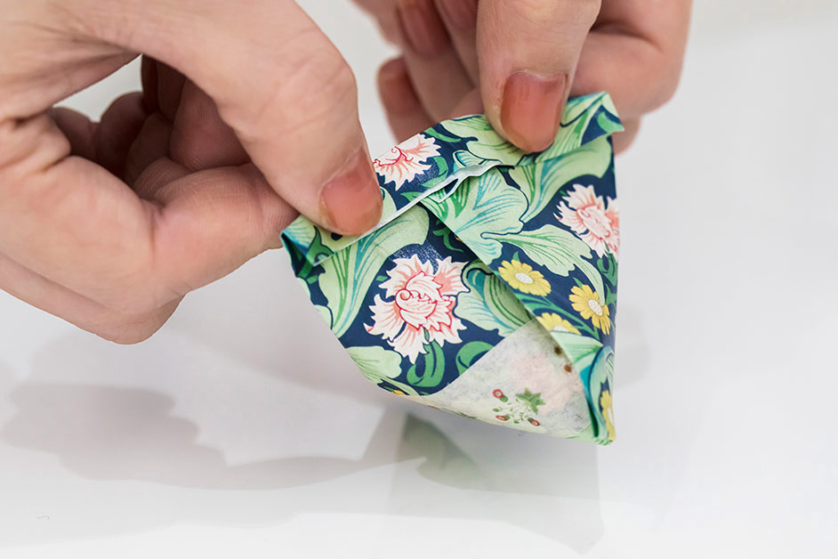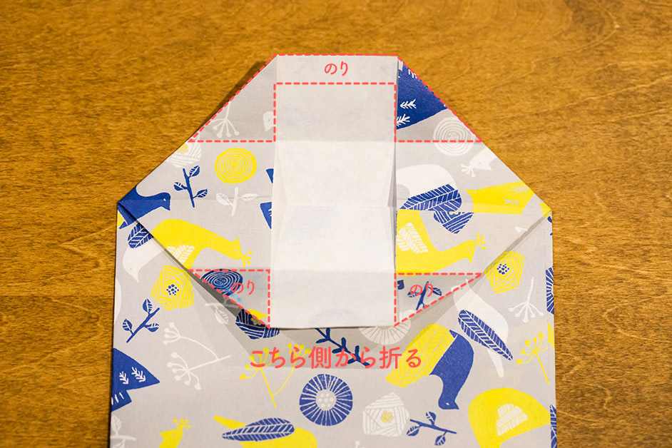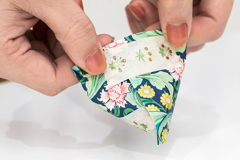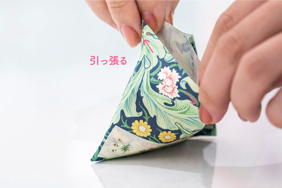 6)開いている部分を矢印の方向に引っ張り、全体が三角形になるよう閉じる