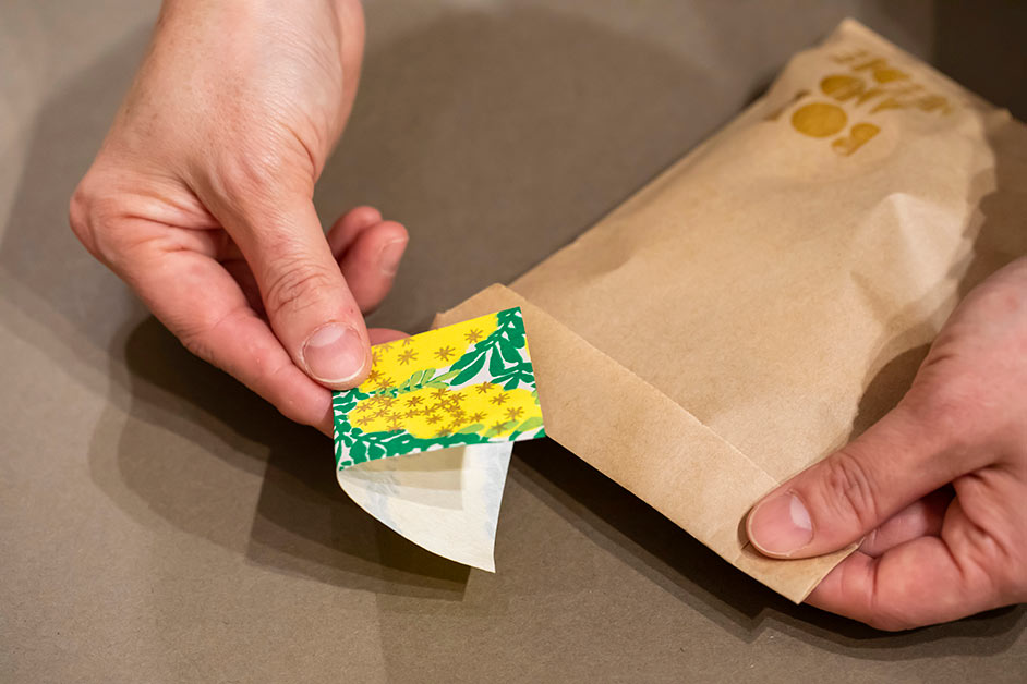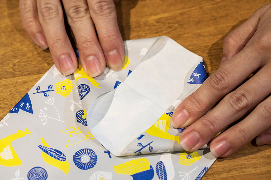 カモ井加工紙の広報・荻野さんに「mt wrap」を使用したラッピングを教えてもらいました。mt wrapは、幅広いテープの両端にのりがついているユニークなマスキングテープ。のりのついた端を合わせて折り畳むだけで、簡単に袋が出来上がります。今回は、小さいお菓子や小物を入れるのにぴったりの「テトラパック」と、定番の「ギフトバッグ」をご紹介。袋を留めるリボンもマスキングテープで作っているんです!
