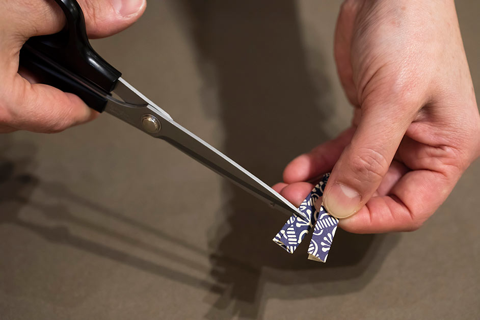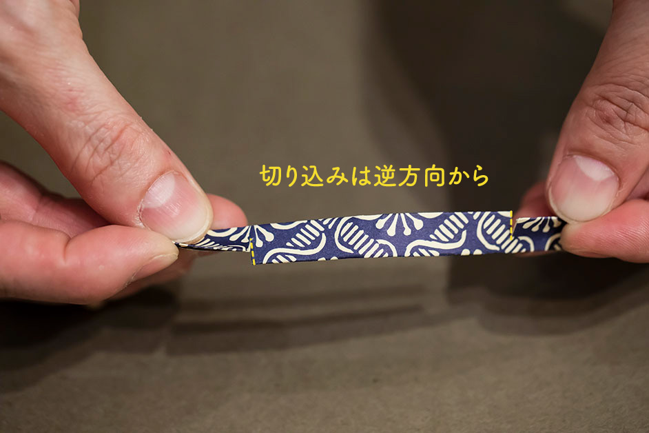 3)折ったハガミの両サイドに切り込みを入れる。このとき切り込みは同じ方向ではなく、画像のようにカットする