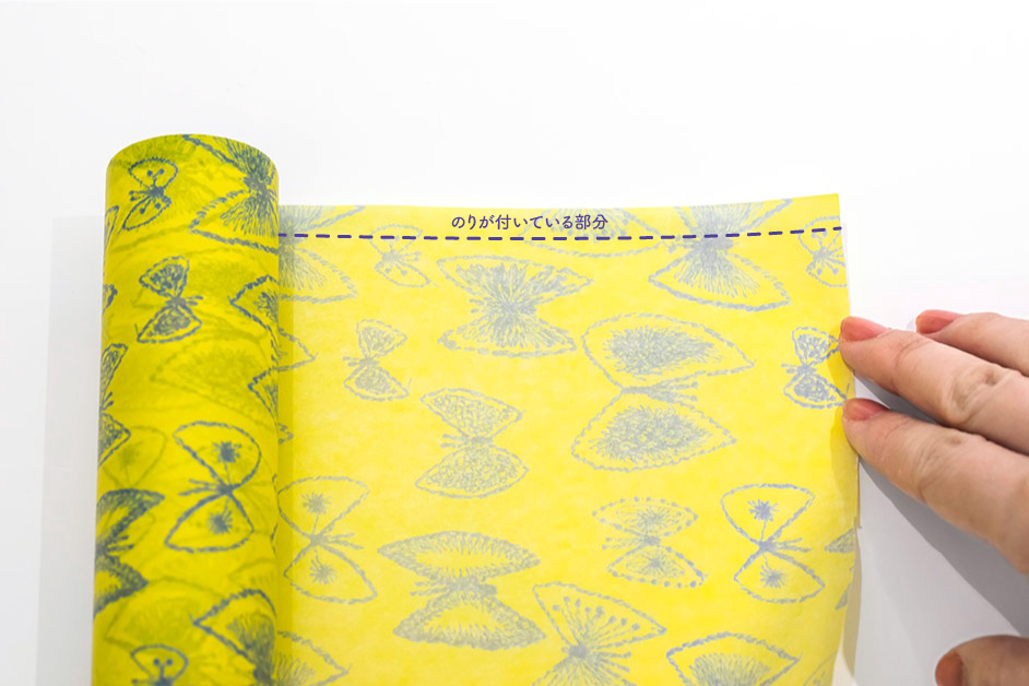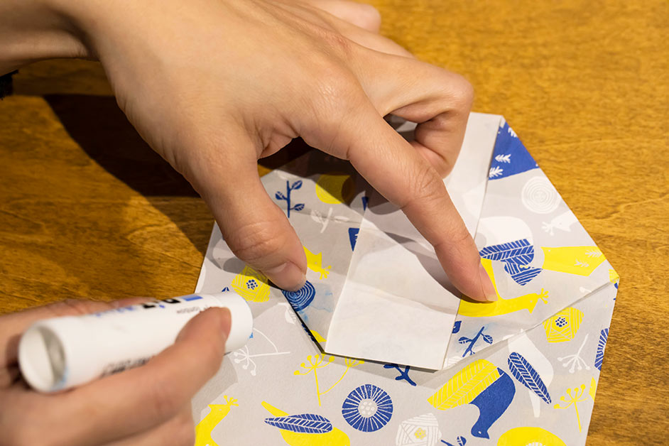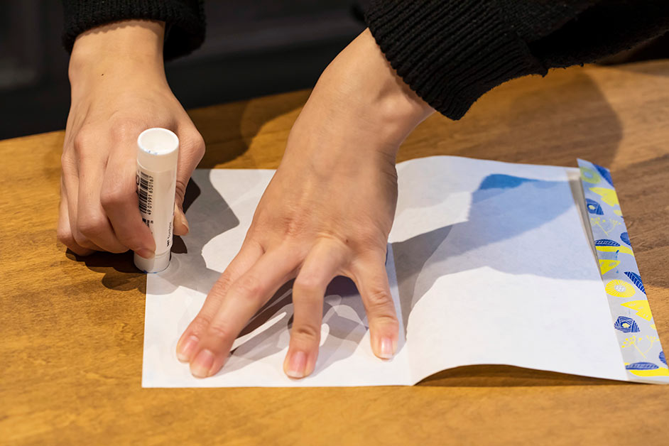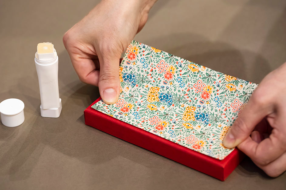 2)紙の裏面全体にのりを塗り、箱に貼れば完成!紙が浮いて剥がれないようしっかりと貼り付けるのがポイント