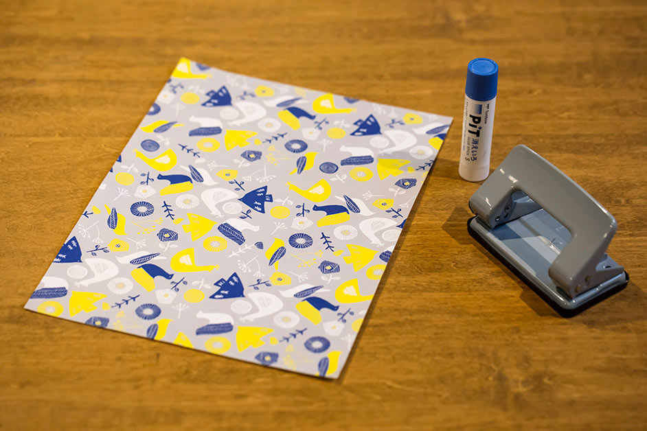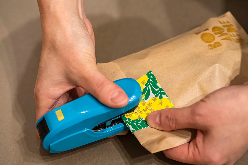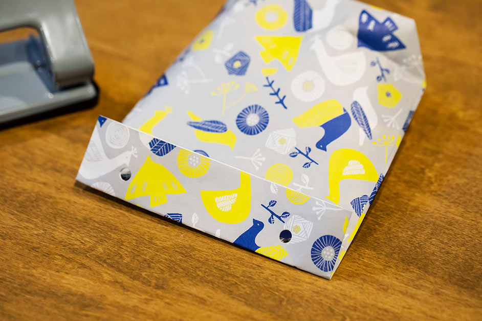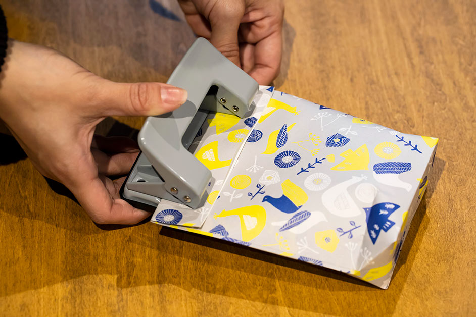 11)包みたいアイテムを袋に入れたら、袋の開き口を折り、パンチで穴を開ける