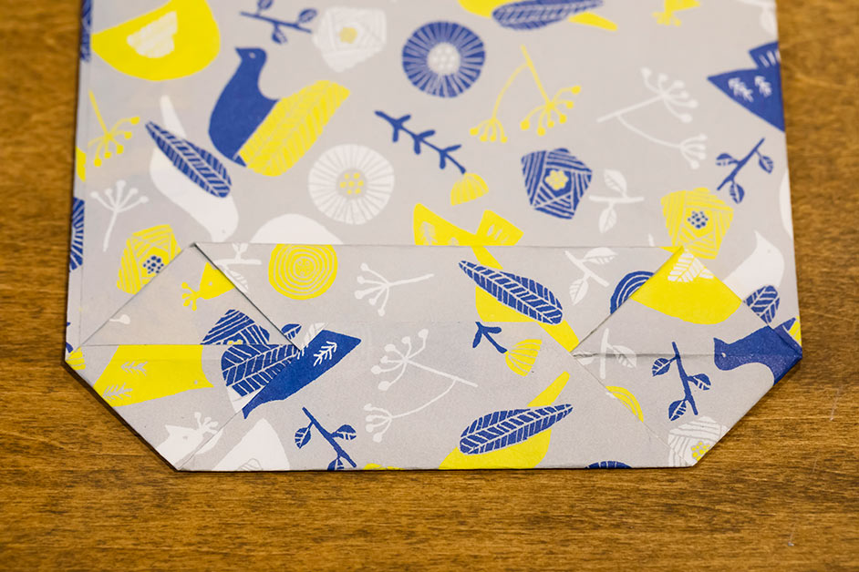 5)マチを作るため、筒の開いている片方を4cm程度折る。のり付けをするので、マチを3cmの幅にしたいときは4cm、4cmの幅にしたいときは5cmのように、1cm多めに折る