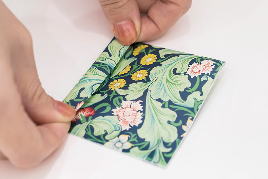 5)半分に折る。このとき、のりの付いている両端部分を重ねあわせて貼り付ける
