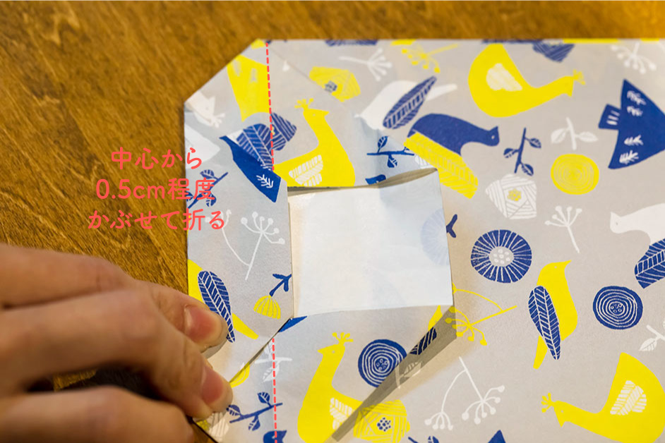 8)底辺の片側を中心線より0.5cm程度かぶせるように折る