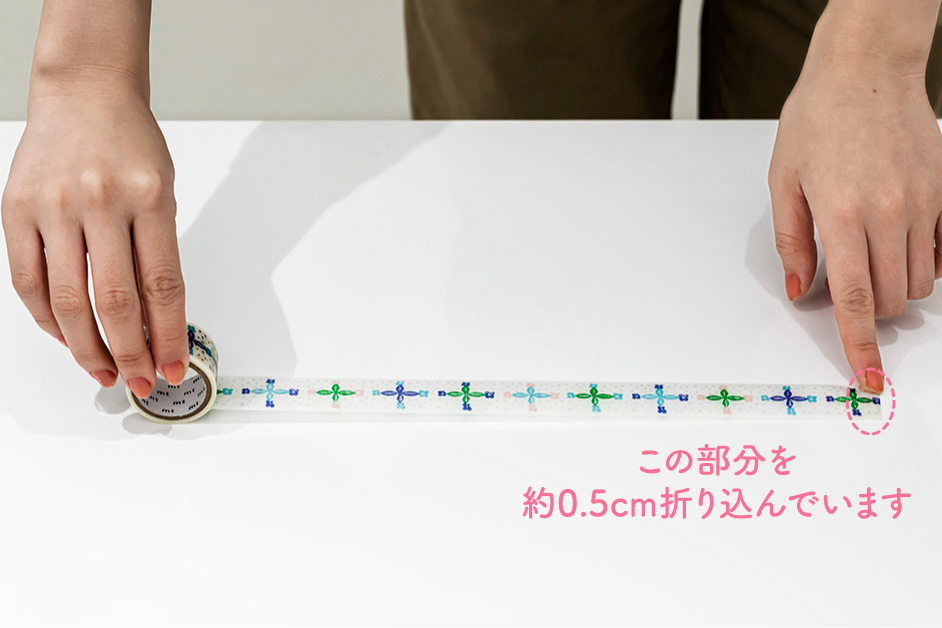 1)まずはリボンを作る。マスキングテープを好みの長さに伸ばし、接着面を上にして置く。2の工程でマスキングテープを重ねるので、両端を0.5cm程度折り、テーブルに貼り付けて固定するのがポイント