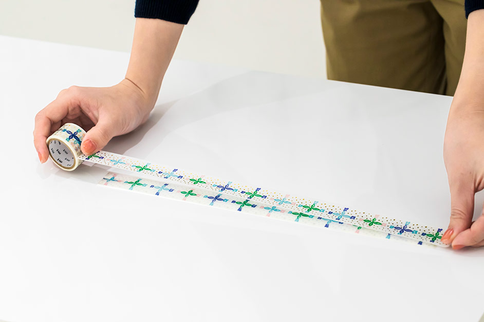 2)同じ長さのマスキングテープを1に重ね、カットする。このとき、裏表同じ柄になるように重ねるとより綺麗に仕上がる