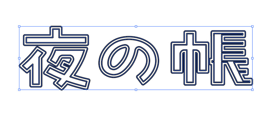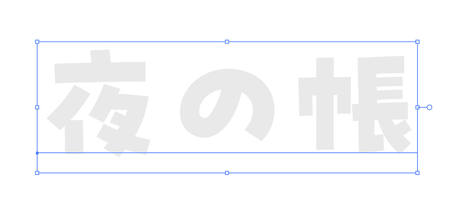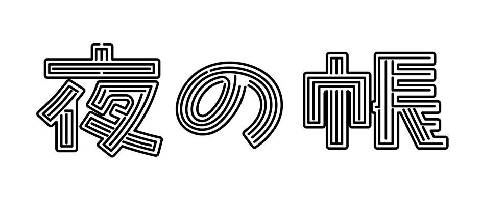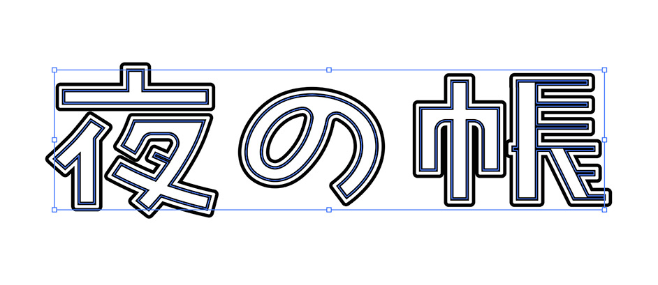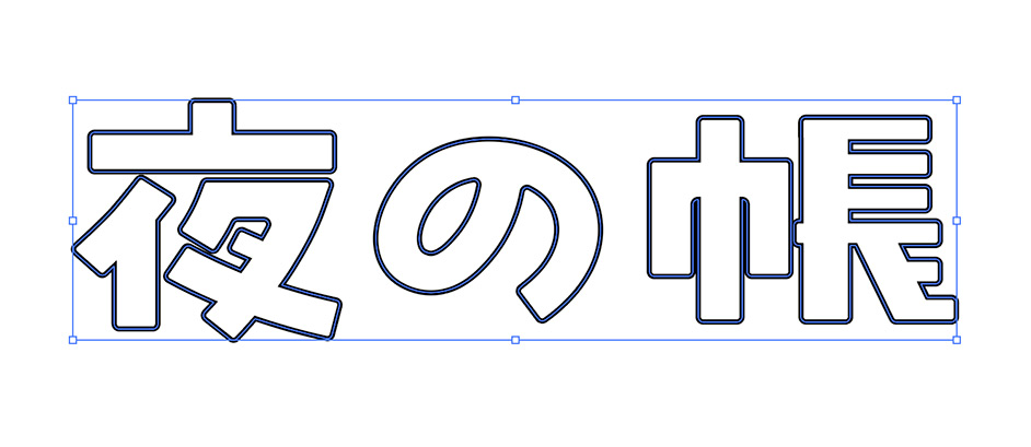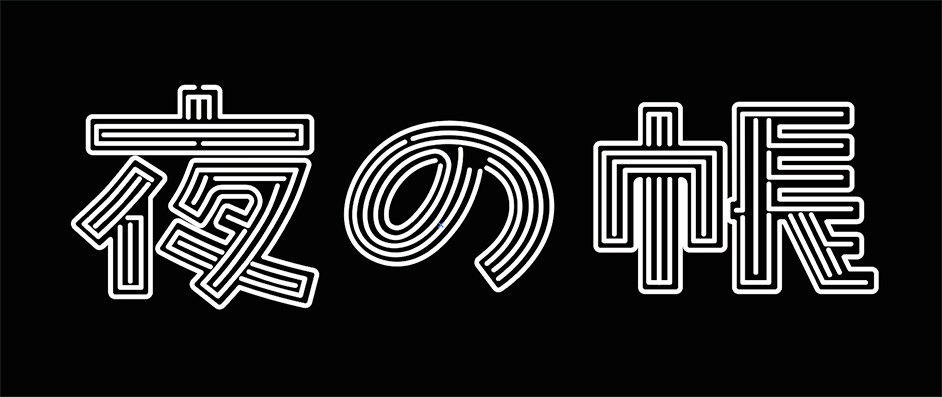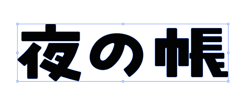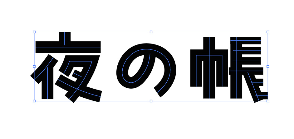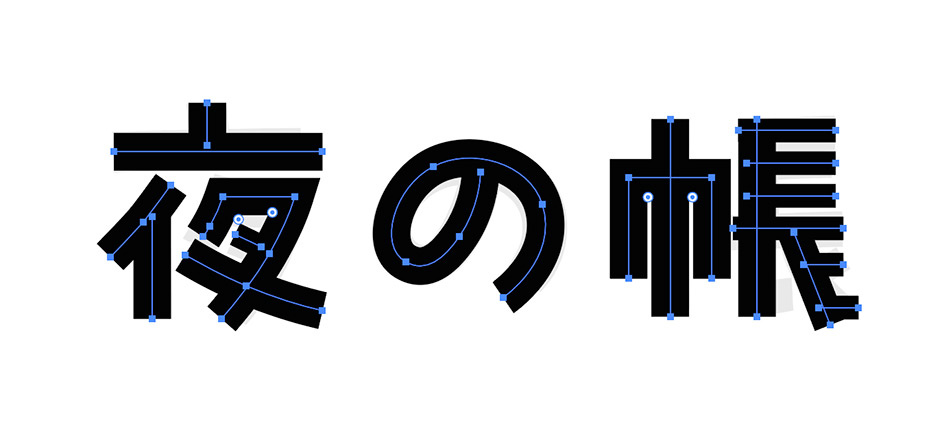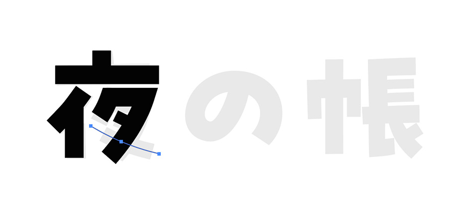 次にIllustratorで新規ドキュメントを[カラーモード:RGBカラー]、[ラスタライズ効果:スクリーン(72ppi)]で作成したあと、ロゴのベースとなる文字の形を作っていく。今回はまず文字ツールを使い「夜の帳」と入力したあと、文字パネルでラフのイメージに近い手書きのような極太ゴシック風の書体「プフ ピクニック H」(モリサワ)に設定してテキストカラーを薄いグレーに変更(図2)。それを参考にしながらペンツールでパスを引いて線パネルで[線幅]を調整していった(図3)(図4)。