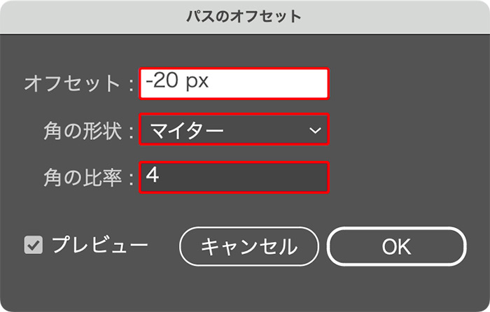さらに、[塗り]を[なし]、[線]を分かりやすい色(ここでは黒)に変更して、線パネルで[線幅:10px]に設定したら(図11)、オブジェクトメニュー→“パス”→“パスのオフセット...”を[オフセット:ー20px]、[角の形状:マイター]、[角の比率:4]で実行する(図12)(図13)。