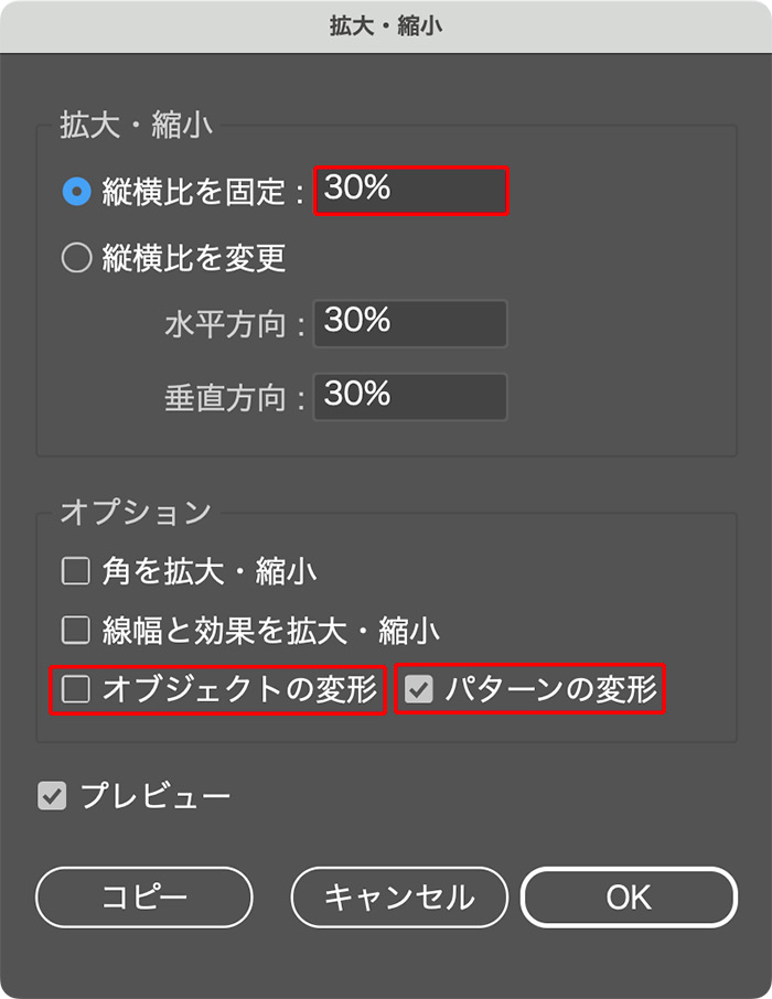 ストライプの大きさを変更したい場合は、月が選択された状態で、オブジェクトメニュー→“変形”→“拡大・縮小...”を選び、[オブジェクトの変形]をオフ、[パターンの変形]をオンにして[縦横比を固定]を好みの数値で適用すればOK(図55)(図56)。