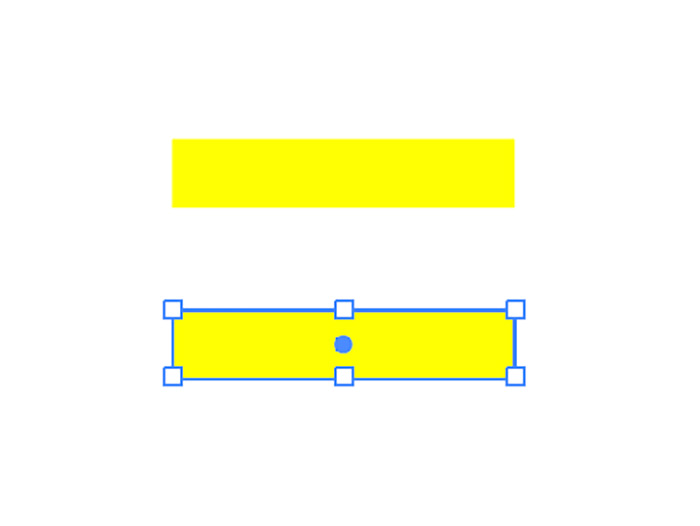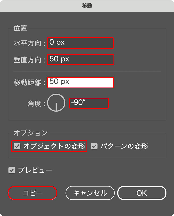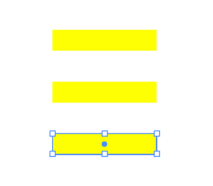 次に、[塗り]を黄色、[線]を[なし]にしたら、長方形ツールでアートボード上を1回クリックしてダイアログを表示し、[幅:100px]、[高さ:20px]で適用(図46)。この細長い長方形を選択した状態で、ツールバーの選択ツールのアイコンをダブルクリックしてダイアログを表示し、[水平方向:0px]、[垂直方向:50px]、[移動距離:50px]、[角度:ー90°]、[オブジェクトの変形]を有効に設定して[コピー]をクリックする(図47)(図48)。続いてcommand+Dキー(Macの場合。WindowsではCtrl+Dキー)を押すと、もうひとつ長方形が同じ間隔で複製される(図49)。