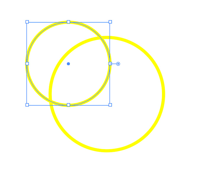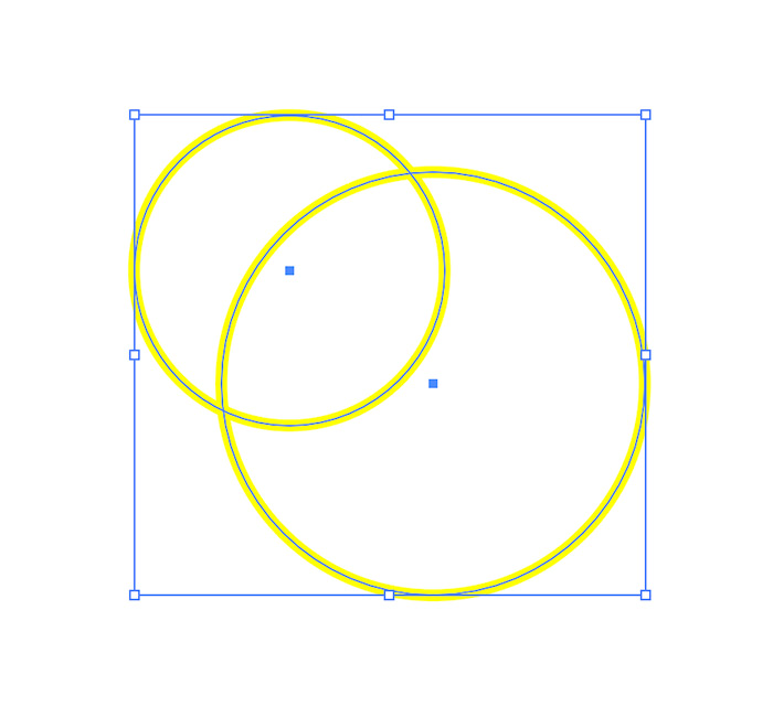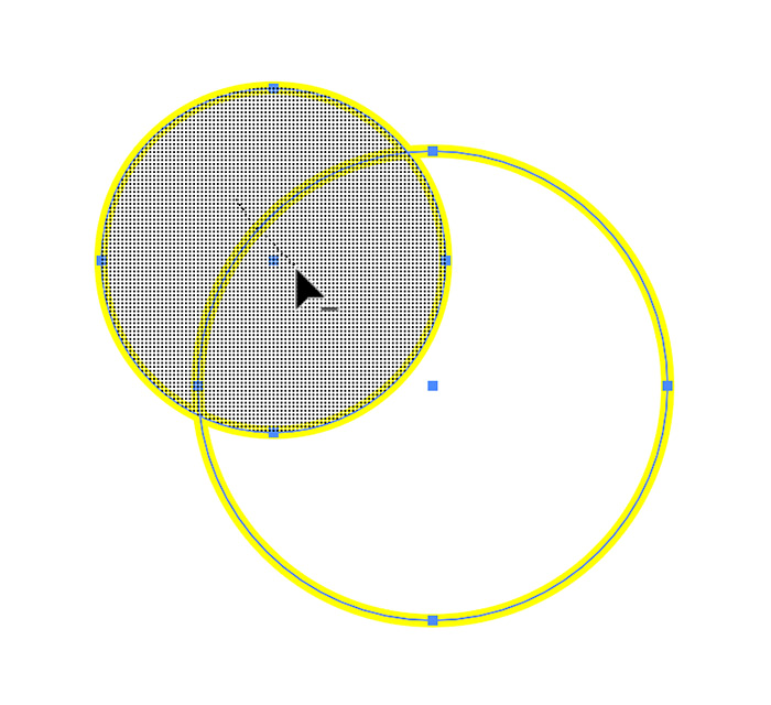 これらふたつの円を両方とも選択したあと(図43)、optiotnキー(Macの場合。WindowsではAltキー)を押しながらシェイプ形成ツールで左上の小さな円の内側をドラッグして(図44)、削除しておく(図45)。