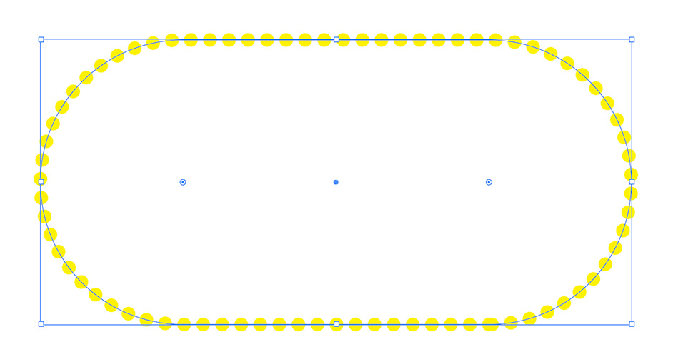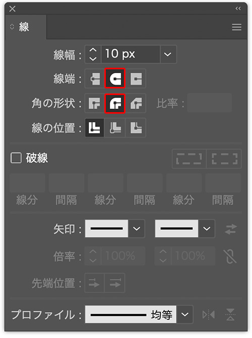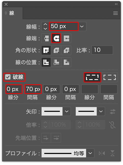 長方形の角にあるライブコーナーウィジェットを内側に最大限ドラッグして角を丸めたら(図21)、線パネルで[線幅:50px]、[線端:丸型線端]、[破線]、[線分と間隔の正確な長さを保持]、[線分:0px]、[間隔:70px]に設定(図22)(図23)。