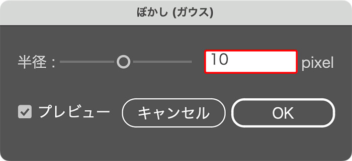 グループ化したパーツが選択された状態のまま、効果メニュー→“ぼかし”→“ぼかし(ガウス)...”を[半径:10pixel]で適用し(図67)、モチーフの輪郭を少しぼかす(図68)(図69)。