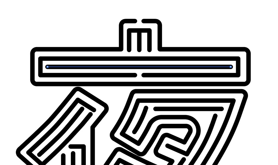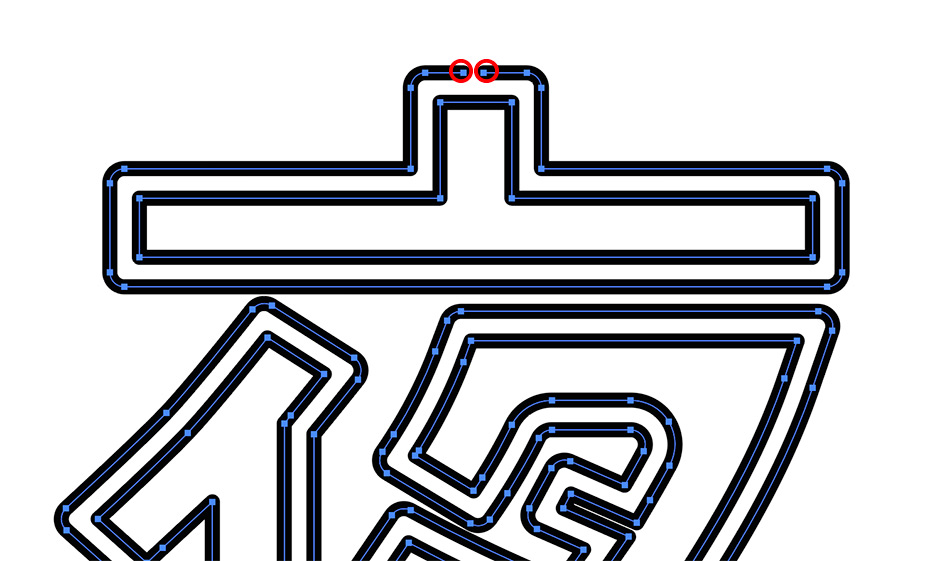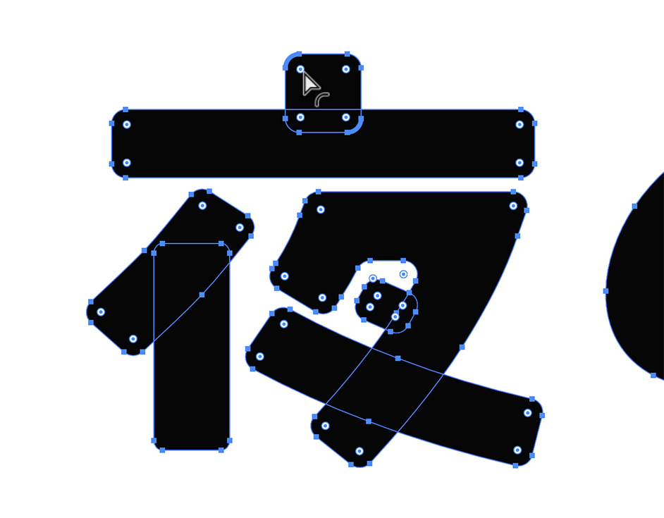 次に、必要に応じてダイレクト選択ツールなどで文字の形を調整したあと、shiftキーを押しながら選択ツールで文字のパーツをすべてクリックして選択し、ダイレクト選択ツールでライブコーナーウィジェット(蛇の目のマーク)を内側にドラッグして文字の角を少し丸める(図8)。