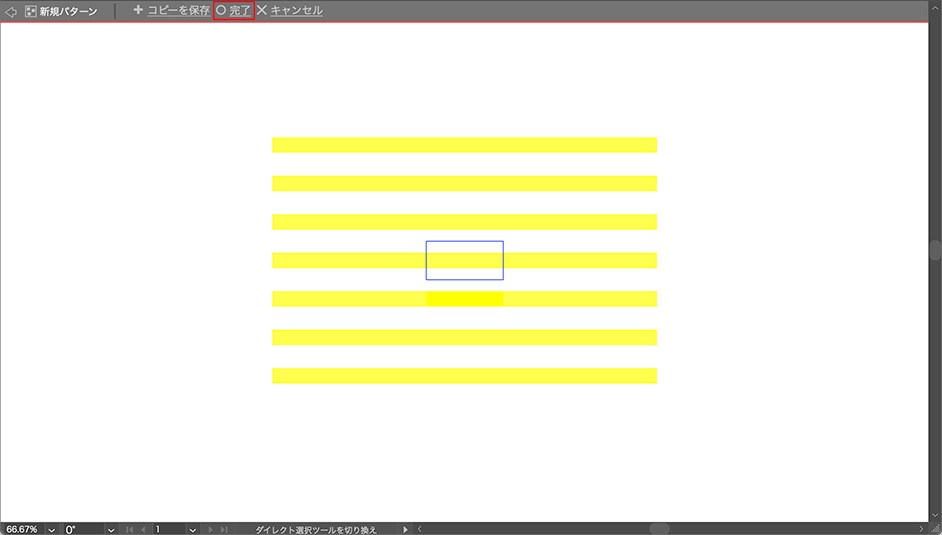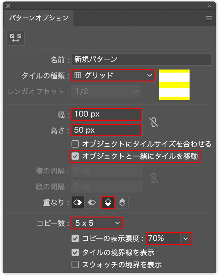 パネル編集画面が表示されるので、パターンオプションパネルで[タイルの種類:グリッド]、[幅:100px]、[高さ:50px]、[オブジェクトと一緒にタイルを移動]をオン、[重なり:上を前面に]、[コピー数:5×5]、[コピーの表示濃度:70%]程度に設定して(図51)、アートボードの上方にある[完了]をクリックして適用する(図52)。