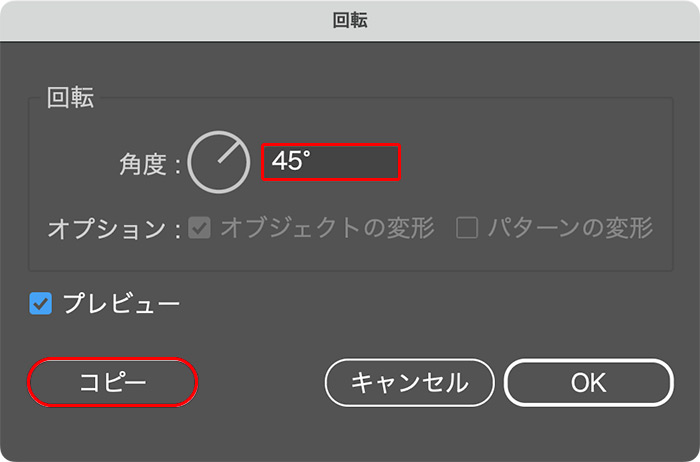 この星形オブジェクトを選択したら、ツールバーの回転ツールのアイコンをダブルクリックしてダイアログを表示し、[角度:45°]で[コピー]をクリックする(図36)(図37)。