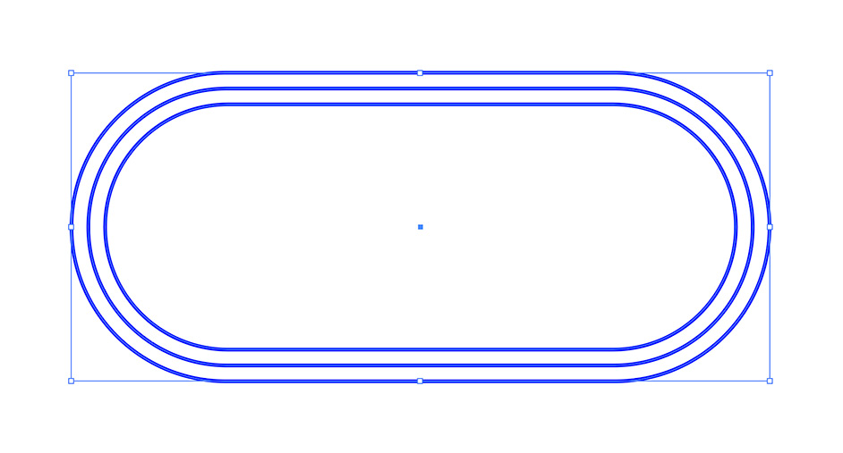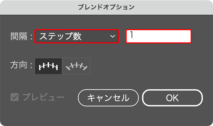 これらふたつの角丸長方形を選択し、オブジェクトメニュー→“ブレンド”→“ブレンドオプション...”を選ぶと「ブレンドオプション」ダイアログが表示されるので、[間隔:ステップ数:1]で適用する(図31)。続いて、ふたつの角丸長方形が選択された状態のまま、オブジェクトメニュー→“ブレンド”→“作成”を実行(図32)。さらに、オブジェクトメニュー→“ブレンド”→“拡張”を適用しておく(図33)。