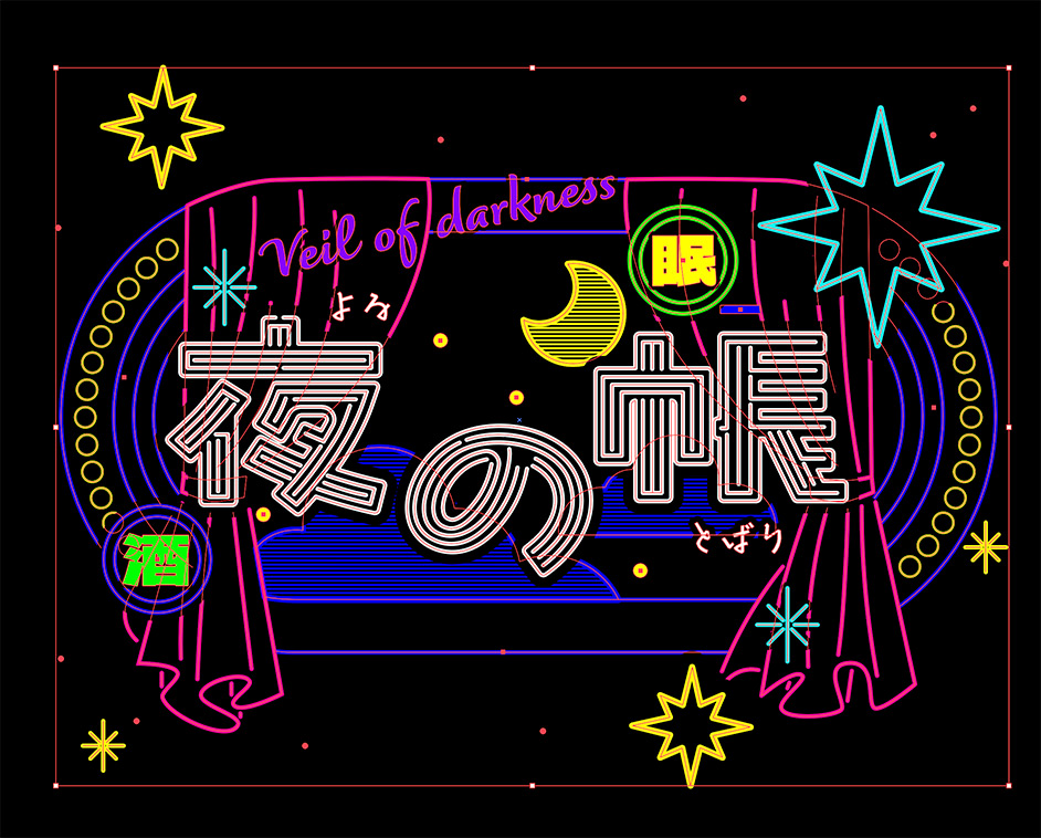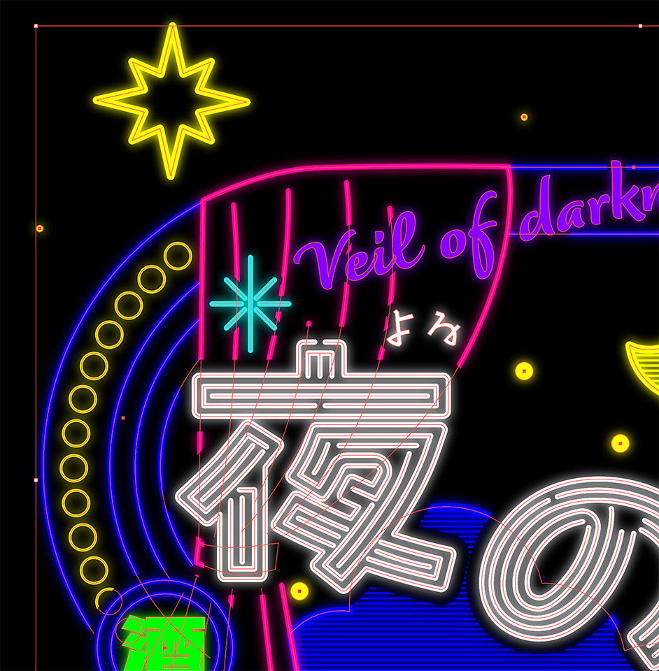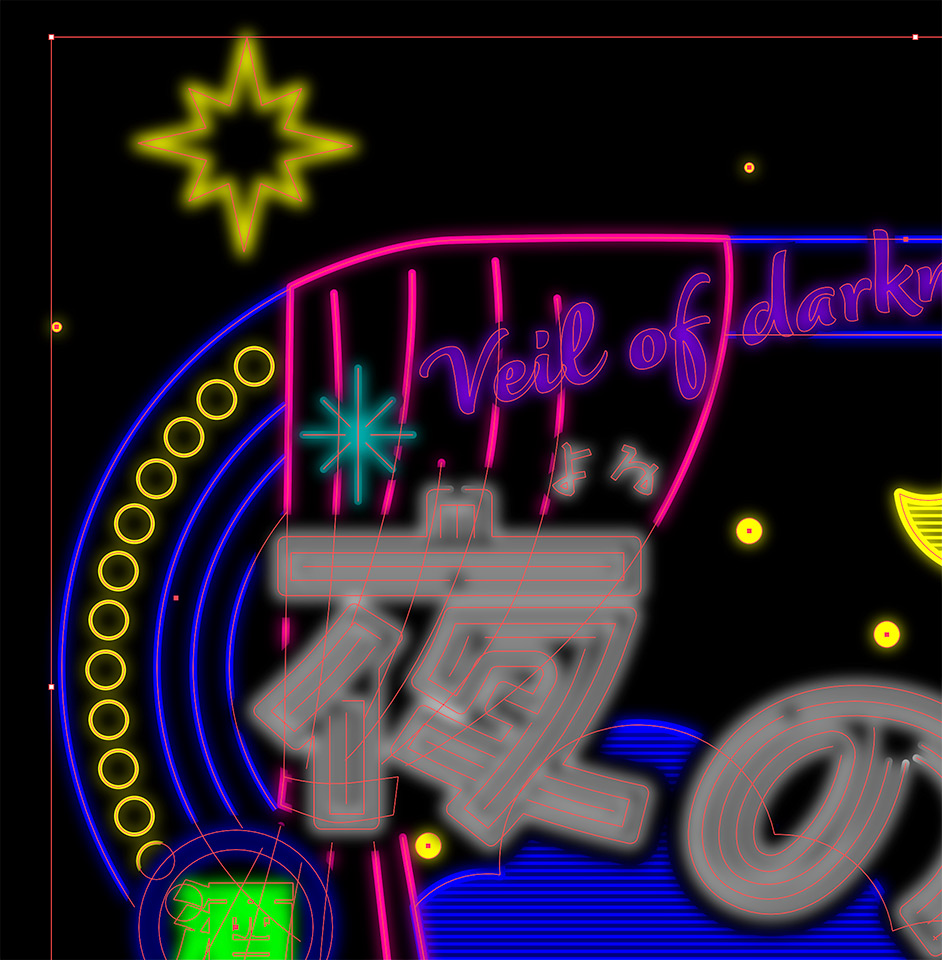 ネオンサインを仕上げていく。ここまでに作成したパーツをレイアウトしたあと、背面に黒い長方形を配置して背景としたり、ペンツールで描いたモチーフや文字要素などを加えてネオンサインをデザインする(図65)。