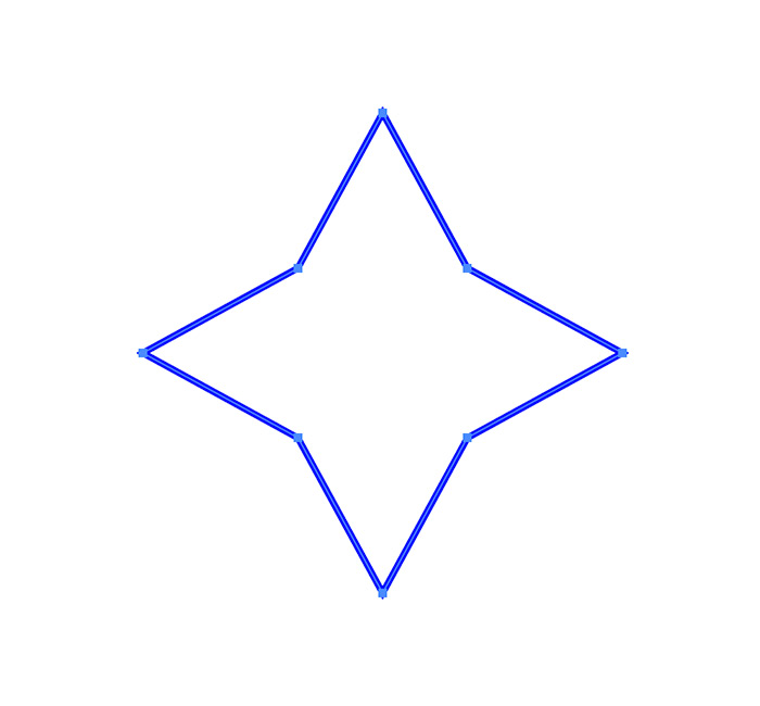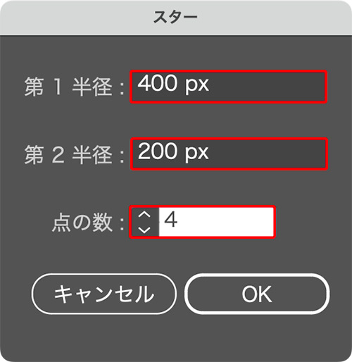 まず、スターツールを選択してアートボード上を1回クリックし、「スター」ダイアログで[第1半径:400px]、[第2半径:200px]、[点の数:4]で実行する(図34)(図35)。