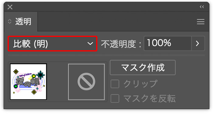 このぼかしたパーツが選択された状態のまま、透明パネルで[描画モード:比較(明)]に変更すれば(図70)(図71)、発光したネオンサインが完成(図72)。