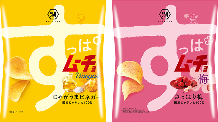 すっぱいだけでなく、爽快な刺激と素材の旨味が感じられる味わいで人気のポテトチップス『すっぱムーチョ』のパッケージ。ビネガーのまろやかな酸味とじゃがいもの旨みが印象的な『じゃがうまビネガー』、梅のほんのりやわらかな酸味やじゅわっとした甘み、じゃがいもの旨みがクセになる『さっぱり梅』の2種類のフレーバーがラインアップされている。