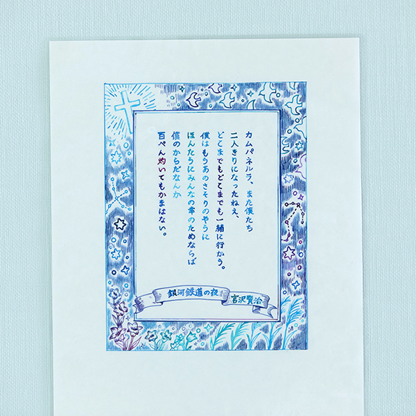 ── 写経からペン字と移行されて、今では文学作品の一文を抜き出してイラストを添えた「文学作品の書き写し」を制作されています。その経緯は?