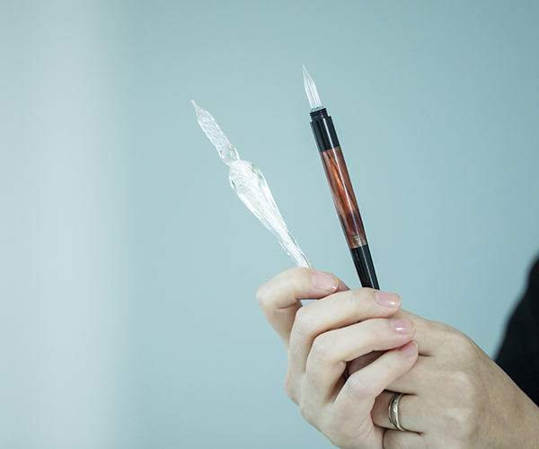 ハコペン 万年筆も使いますが、この2本のガラスペンが多いですね。細い線と太い線で使い分けています。制作時は「書写台」の上に紙を置いて制作しているのですが、最初の頃は使っていませんでした。時を忘れて描くことを繰り返していたら、少し前に頸椎を傷めてしまって……(笑)。今では手放せない道具です。