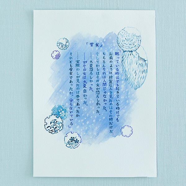 色から発想するほかにも、書写のお題をツイートしてくれるTwitterのアカウントからお題を拝借することも多いですね。例えば『雪女』という作品がそうです。寂しさみたいなものを色に感じたので、背景は「ダイヤモンドダスト」(Tono&Lims)、紫の部分は「樹氷アメジスト」(八文字屋)というインクで描こうと思いました。