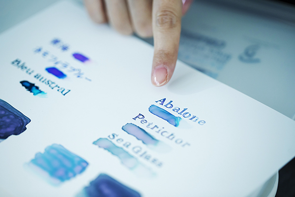 ※ “遊色”という呼び方は、本来はオパールなど、鉱石の結晶の構造によって光の反射光ででるものをいうため、インクの呼び方としては賛否両論あり、まだ定まっていないという。本インタビューでは、「ゆらぎやすく、分離しやすいインク」の意味で使用しています。