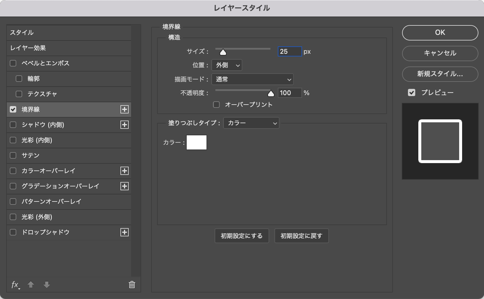 レイヤーメニュー→“レイヤースタイル”→“境界線...”を[サイズ:25px]、[位置:外側]、[描画モード:通常]、[不透明度:100%]、[塗りつぶしタイプ:カラー]、[カラー:白]で適用する(図3)(図4)。