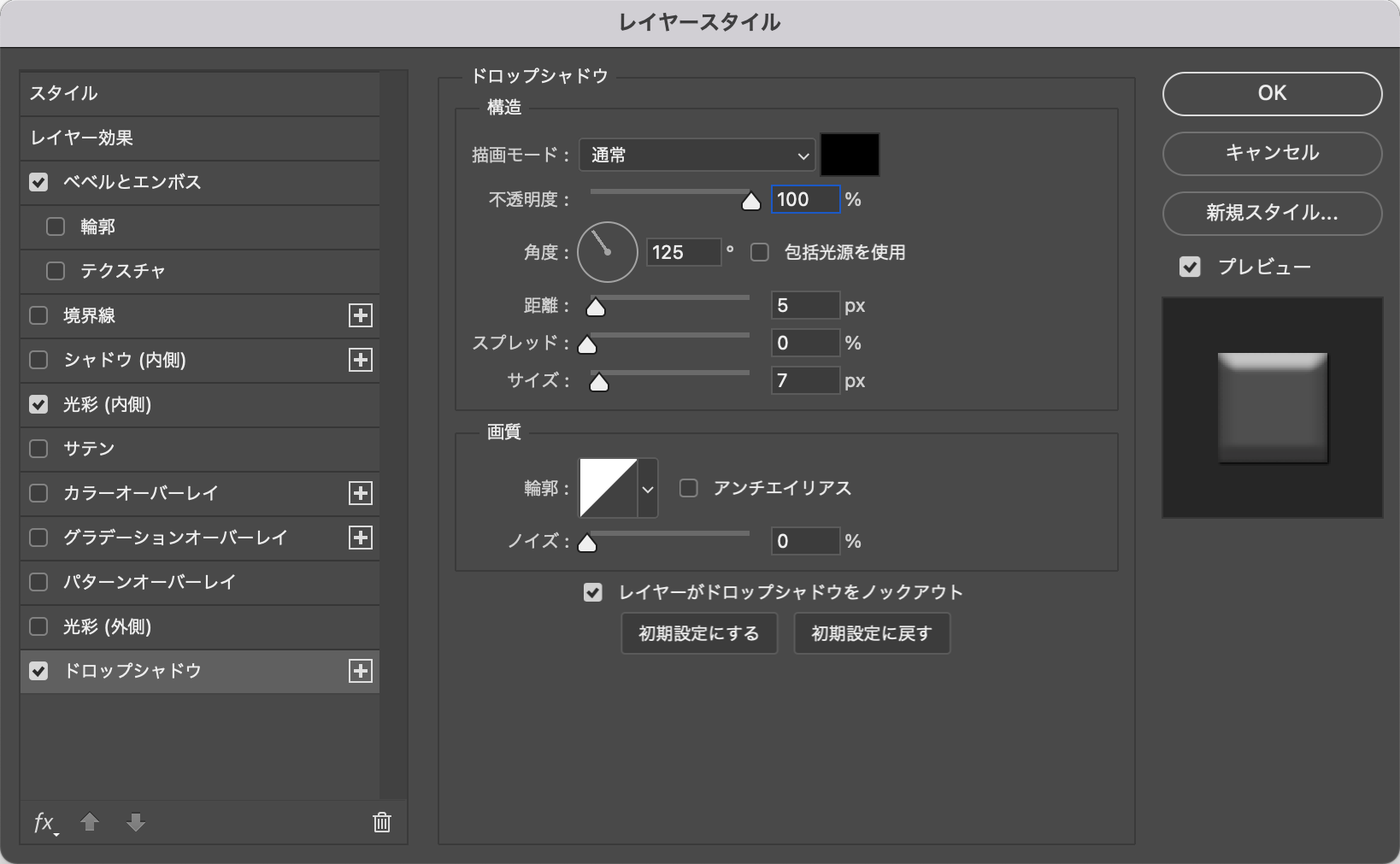 さらにレイヤースタイルの[ドロップシャドウ]を選択して、[描画モード:通常]、[シャドウのカラー:黒]、[不透明度:100%]、[角度:125°]、[距離:5px]、[スプレッド:0%]、[サイズ:7px]、[輪郭:線形]、[ノイズ:0%]に設定して適用(図7)。レイヤーパネルで先ほど非表示にした背景レイヤーを表示させておく(図8)。