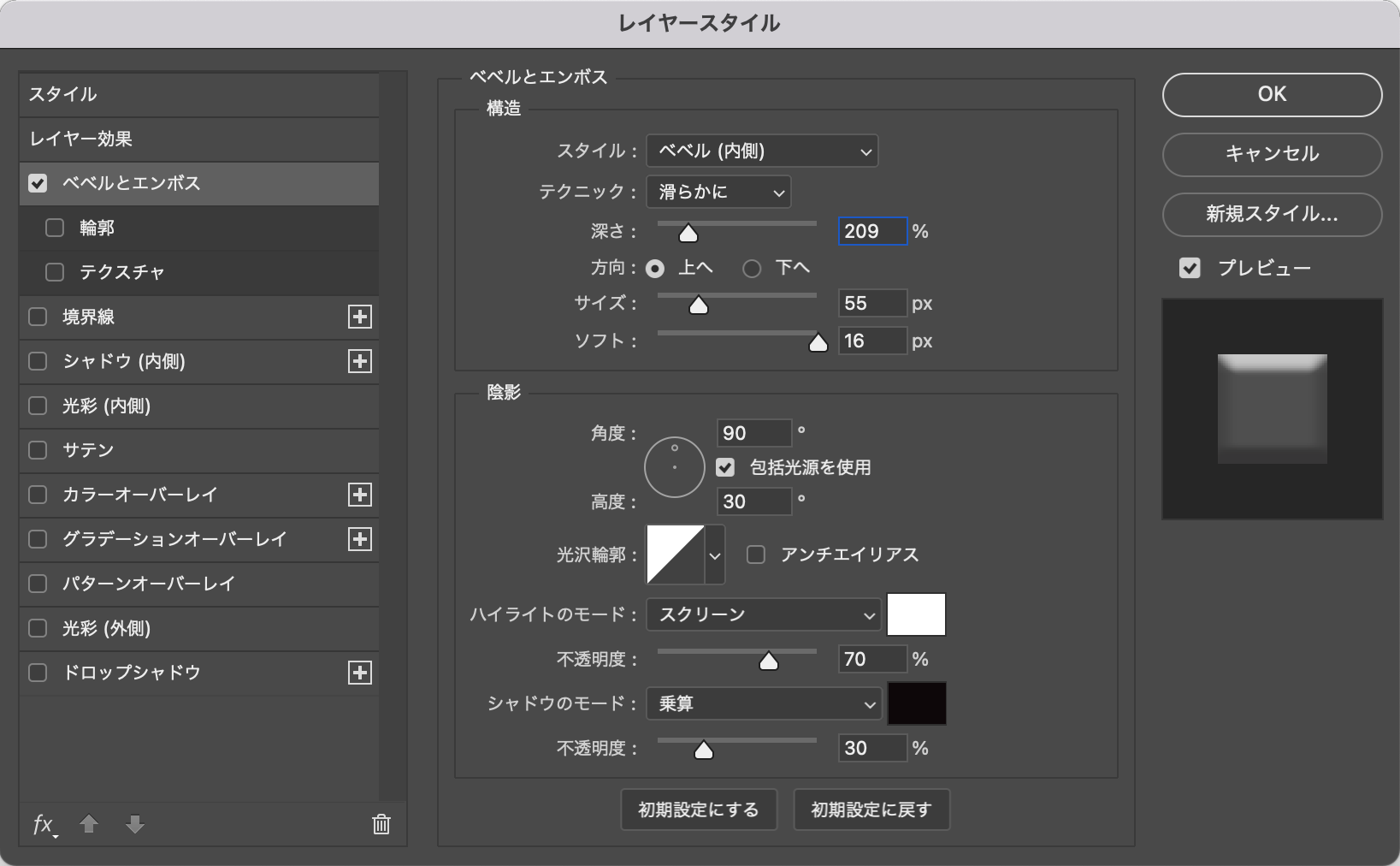 次に、レイヤーメニュー→“ラスタライズ”→“レイヤースタイル”を実行したあと、レイヤーメニュー→“レイヤースタイル”→“ベベルとエンボス...”を[スタイル:ベベル(内側)]、[テクニック:滑らかに]、[深さ:209%]、[方向:上へ]、[サイズ:55px]、[ソフト:16px]、[光沢輪郭:線形]、[ハイライトのモード]を[不透明度:70%]、[シャドウのモード]を[不透明度:30%]に設定(図5)。