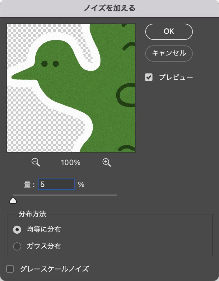 さらに一手間。レイヤーパネルでモチーフのレイヤーを選択したまま、フィルターメニュー→“ノイズ”→“ノイズを加える...”を[量:5%]、[分布方法:均等に分布]に設定し、[グレースケールノイズ]のチェックは外して適用する(図9)。