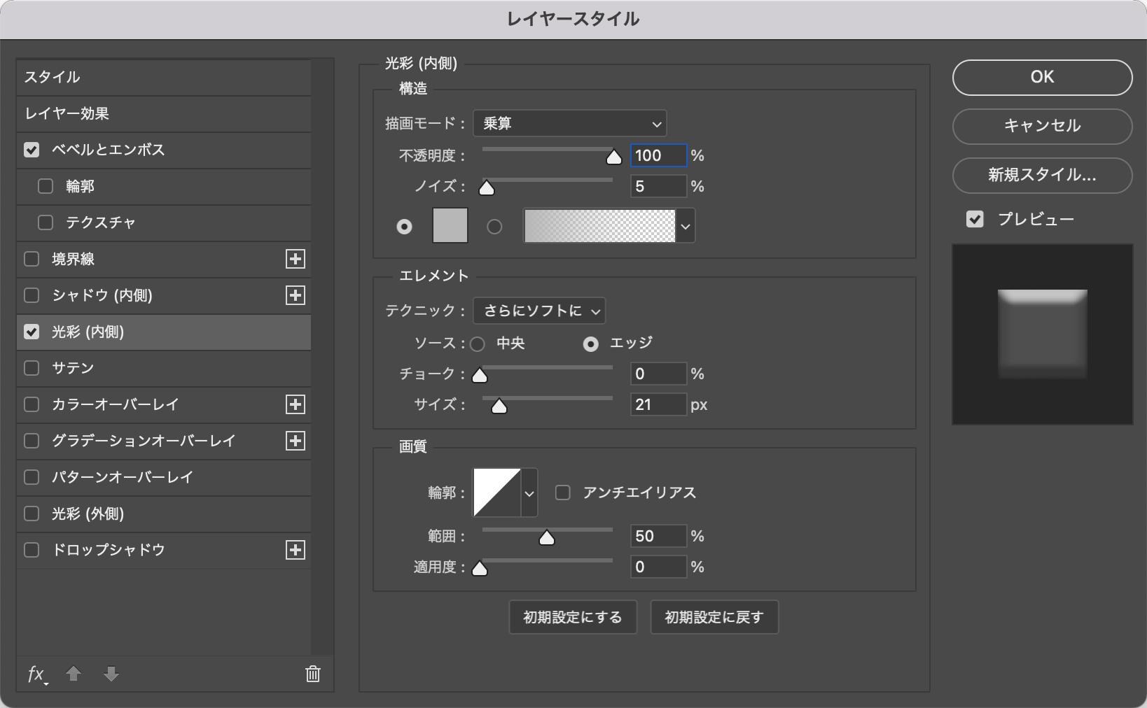 続いて、レイヤースタイルの[光彩(内側)]を選択して[描画モード:乗算]、[不透明度:100%]、[ノイズ:5%]、[光彩のカラー:グレー]、[テクニック:さらにソフトに]、[ソース:エッジ]、[サイズ:21px]、[輪郭:線形]、[範囲:50%]に設定する(図6)。