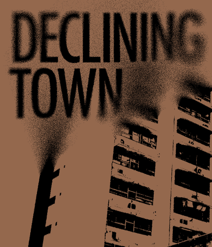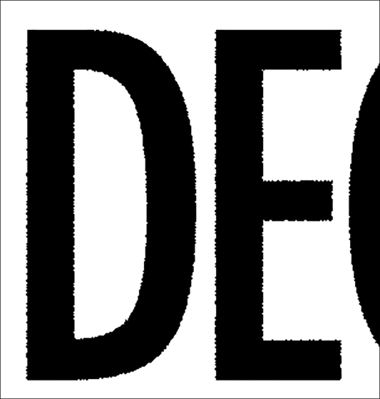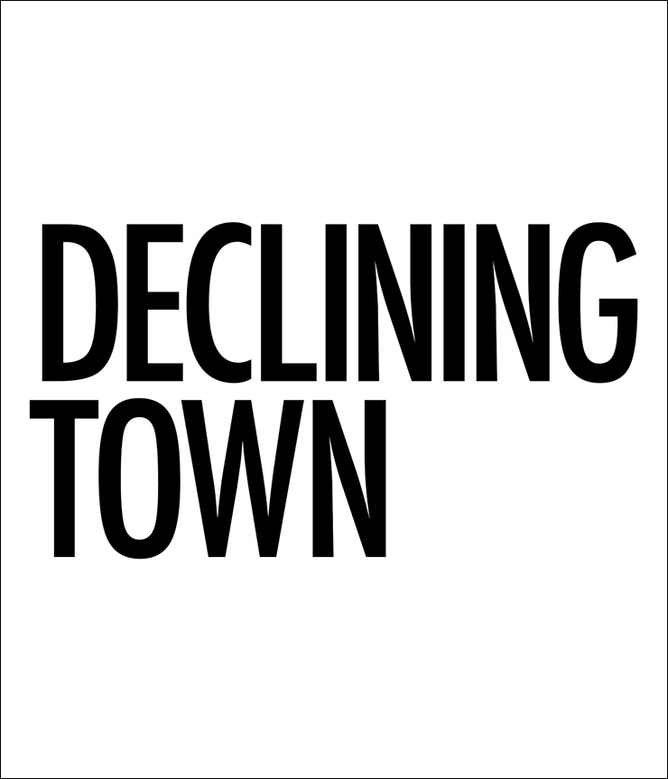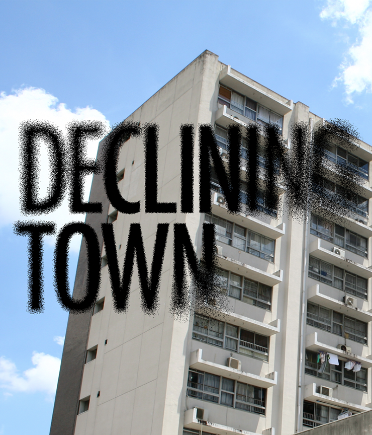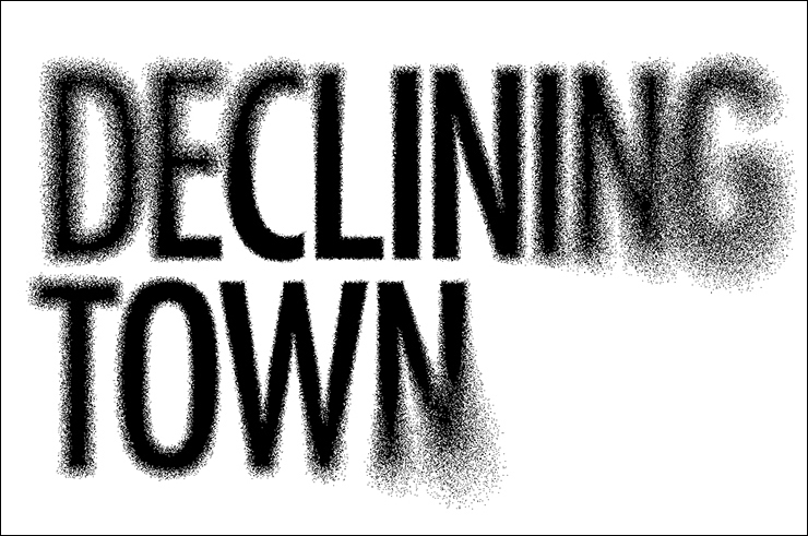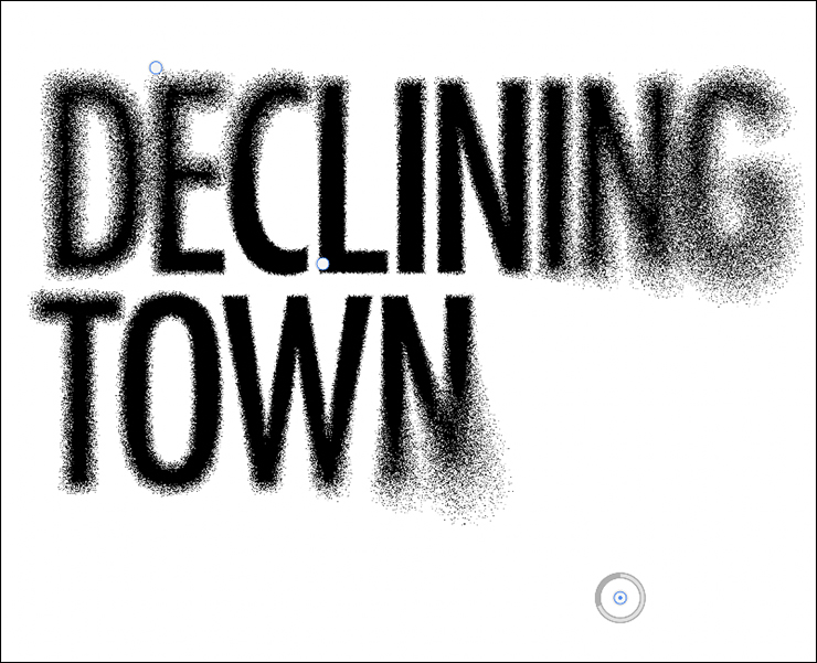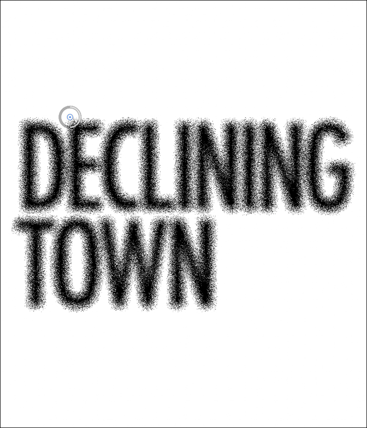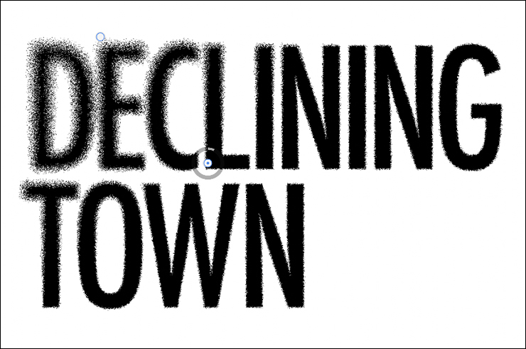 まずは新規ファイルを[幅:1200ピクセル]、[高さ:1400ピクセル]、[解像度:350ピクセル/インチ]で作成したら、横書き文字ツールで元になる文字(ここでは「DECLINING TOWN」)を入力し、文字パネルでフォントやフォントサイズなどを設定(図1)。