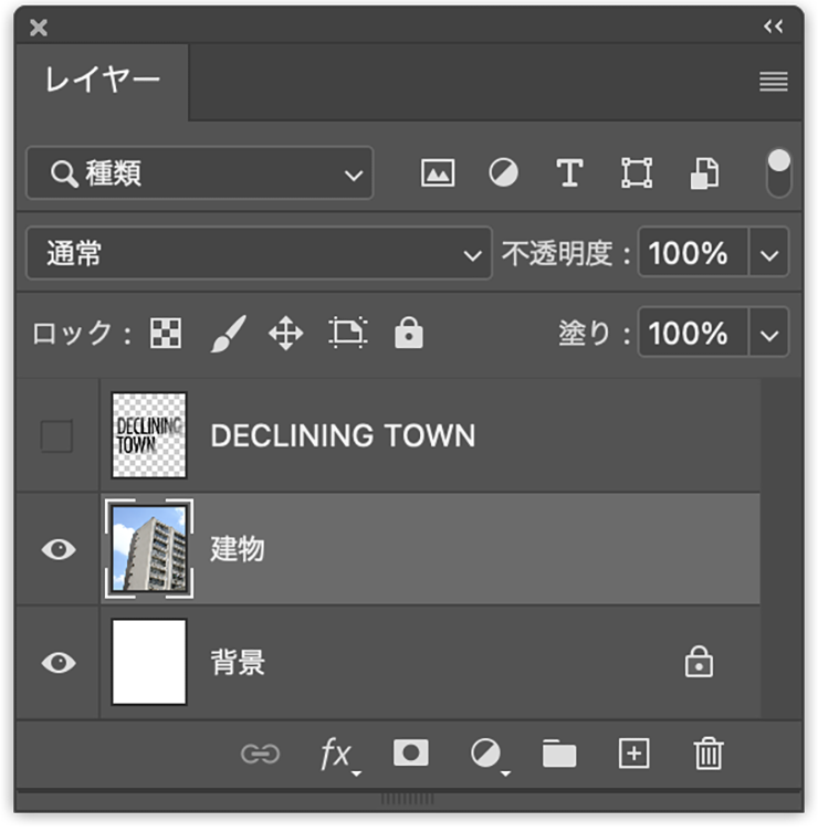 写真を2階調化していく。任意の写真(ここでは建物の写真)を文字の背面に配置したら(図9)、レイヤーパネルで文字のレイヤーをいったん非表示にしておく(図10)(図11)。