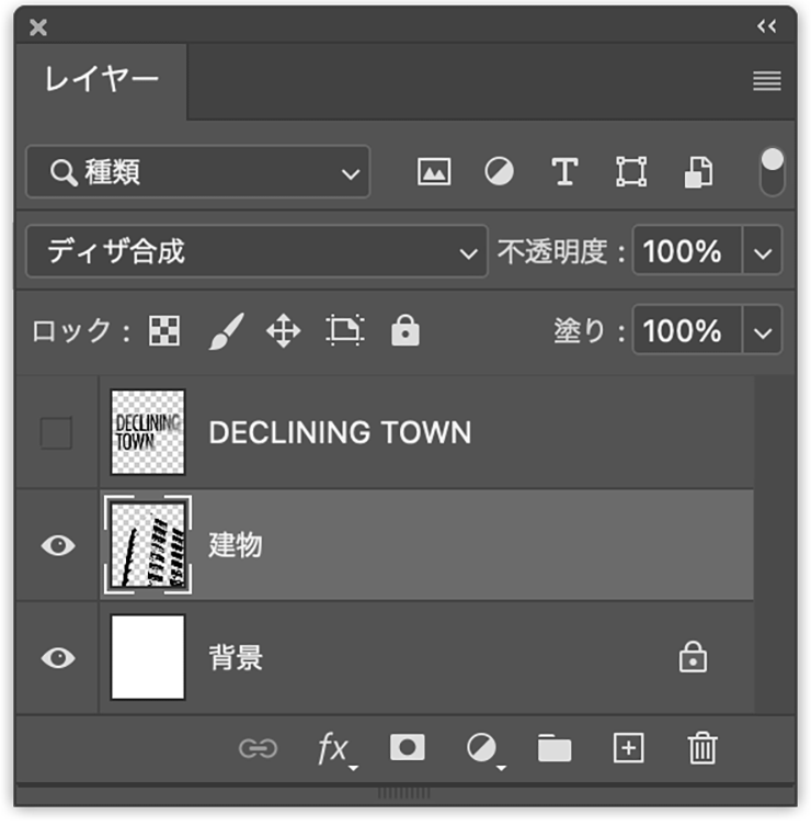 ここからは建物の写真をスパッタリング風に加工していく。まず、レイヤーパネルで背景レイヤーを表示したら、建物のレイヤーを選択し[描画モード:ディザ合成]に変更する(図15)(図16)。
