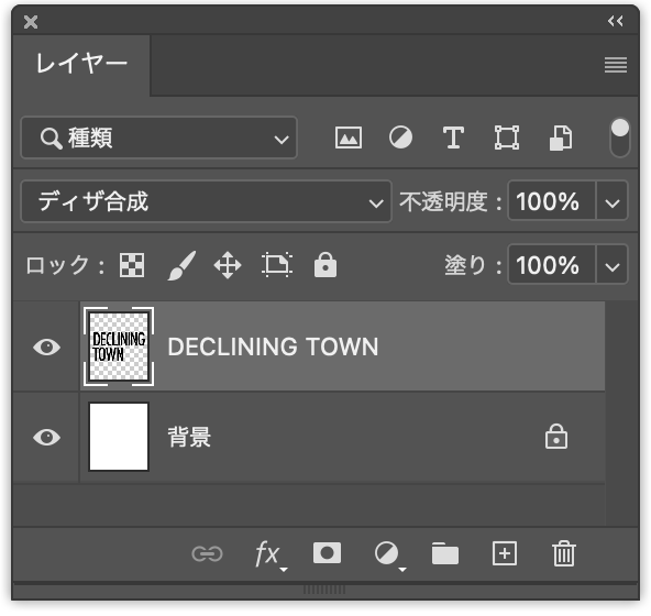 レイヤーパネルで文字のレイヤーを選択して、レイヤーメニュー→“ラスタライズ”→“テキスト”を適用し、[描画モード:ディザ合成]に変更しておく(図2)(図3)。