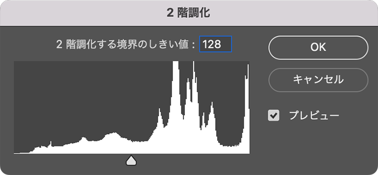 レイヤーパネルで建物のレイヤーを選択したあと、イメージメニュー→“色調補正”→“2階調化...”を選び、プレビューを確認しながらちょうどいい白黒画像になるよう[2階調化する境界のしきい値]のスライダーを動かして調節する。ここでは[2階調化する境界のしきい値:128]で適用した(図12)(図13)。