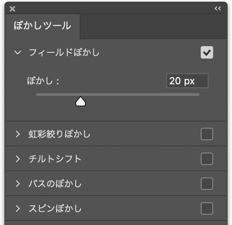次に、フィルターメニュー→“ぼかしギャラリー”→“フィールドぼかし...”を選択し、フィールドぼかしピンをドラッグして位置を調整したあと(図4)、[ぼかし:20px]に設定する(図5)。