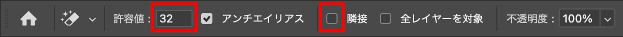 次に、マジック消しゴムツールを選択し、オプションバーで[許容値:32]にしたら[隣接]のチェックを外す(図4)。続いて、画像の白い部分を1回クリックして透明にする(図5)。