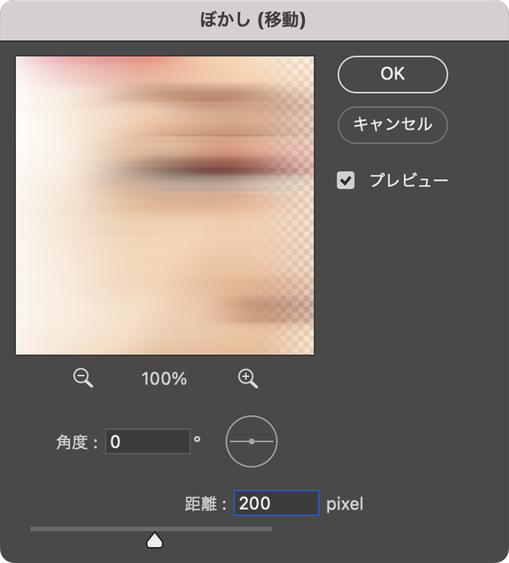 そのレイヤーを前面に複製したら、複製した方のレイヤーにフィルターメニュー→“ぼかし”→“ぼかし(移動)...”を[角度:0°]、[距離:200pixel]で適用する(図6)(図7)。