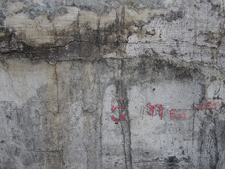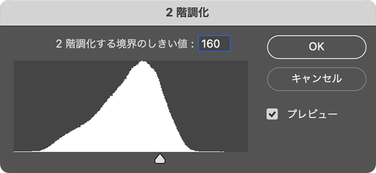 グラフィックに質感をつけてグランジ風に演出する。コンクリートなどのざらついた質感の写真素材を用意して開き(図15)、イメージメニュー→“色調補正”→“2階調化...”を選択。ざらつき部分が白く残るようにヒストグラムのスライダーを動かして適用する。ここでは、[2階調化する境界のしきい値:160]として適用したが(図16)(図17)、素材や表現したいイメージによっても最適値は異なるため、プレビューを確認しながら調節してみてほしい。