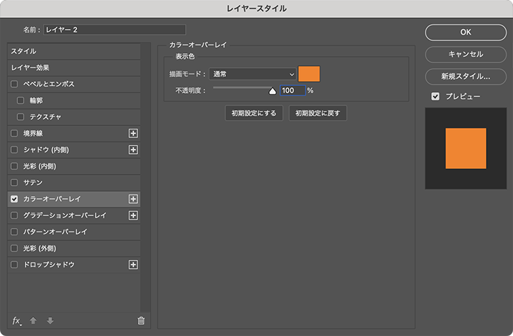 レイヤーパネルで、この素材のレイヤーが選択された状態でレイヤーメニュー→“レイヤースタイル”→“カラーオーバーレイ…”を選び、[描画モード:通常]、[オーバーレイのカラー]をオレンジ(ここでは[R:255、G:126、B:0])、[不透明度:100%]で適用する(図20)(図21)。
