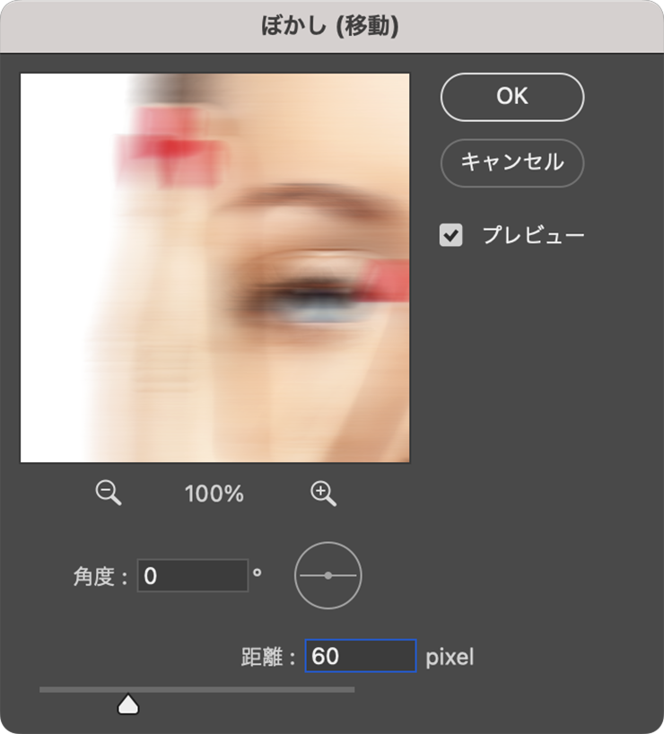 レイヤーパネルで元写真のレイヤーを選択したあと、長方形選択ツールで写真の左半分に選択範囲を作成し(図2)、選択部分をコピー&ペーストする。レイヤーパネルでペーストされたレイヤーを選択したあと(図3)、フィルターメニュー→“ぼかし”→“ぼかし(移動)...”を[角度:0°]、[距離:60pixel]で適用する(図4)(図5)。